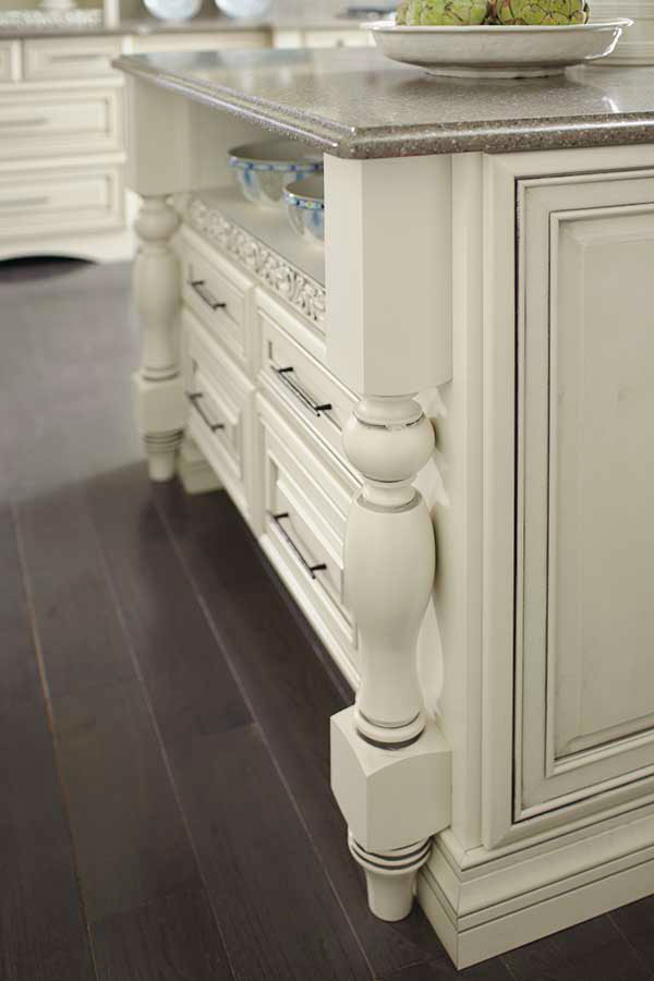 The French Country cabinet leg adds graceful curvature to support a traditional design theme.