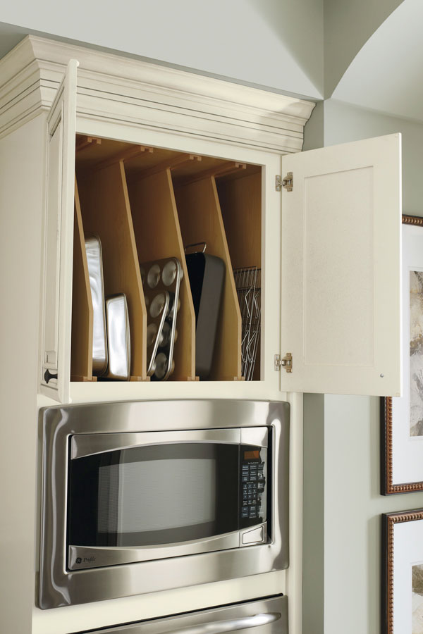 Storing party trays, serve ware and even seldom used bakeware is ideal above the oven, using our Oven Cabinet with Tray Dividers built right in to the top of the cabinet.