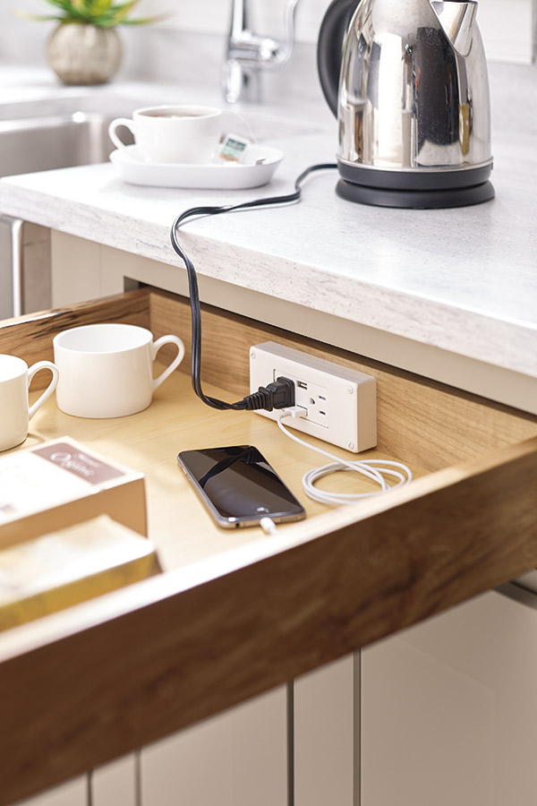 Power up digital devices without cluttering up countertops or sacrificing cabinet drawer space. A factory installed 120V outlet at the back of the cabinet drawer box boasts dual 3-prong receptacles along with a pair of USB ports.